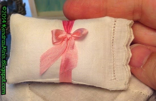 - Now cut the pillowcase from the hanky allowing about a 1/8 inch seam. Trim, Fray Check and glue the corners as described in steps 6-12 of my previous blog (click here to go there). Turn inside out and work on the corners getting them pointed (previous blog again).